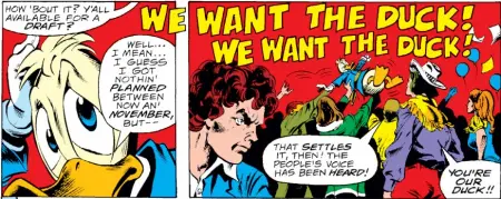 Alright, what's the big deal? Another comic book story come and gone. Howard runs for President, loses, then probably ends up in space, fights a giant gingerbread man, maybe teams up with ROM Space Knight or something. We get it.