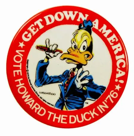 Howard's campaign started to bleed into our world in the back of Howard the Duck issue 4, where it was announced that Howard would be Marvel's first candidate for President, and that for $1.25, you could have your very own Howard election kit, including this sweet button: