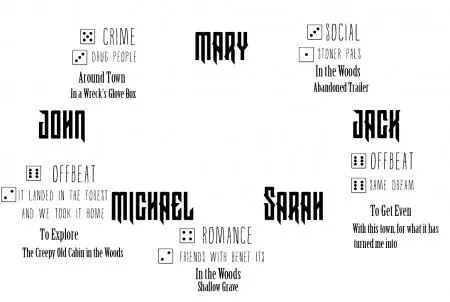 Next up, Jack and Mary, stoner pals, are connected by a Location: An abandoned trailer in the woods. Although it's not particularly interesting, it sounds like those two hang out there, so they are (or used to be) pretty close friends. This location might come in handy later, maybe for a scene where Mary realizes just how far gone her friend is and freaks out.