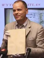(Note: the man in this photo is not Anders Burius, but rather an investigator proudly displaying a recovered atlas Burius stole; image courtesy The History Blog)