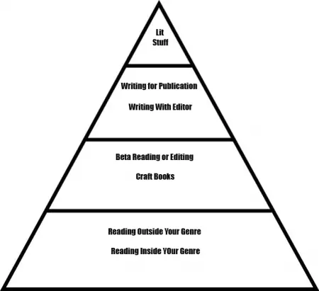This weight loss made me wonder if writers are getting a lot of bullshit and even unhealthy writing advice from the literary establishment, just as people were getting bad advice from the nutritionists who designed the food pyramid. Is focusing a majority of your time on being the best literary citizen the equivalent to eating a lot of needless carbs? We are told to read and write, but what kind of reading and writing? That statement can sound as trivial and uninformative as ‘eat healthy and exercise.’ It hit me that young writers like myself could use a food pyramid for craft. So here it goes!
