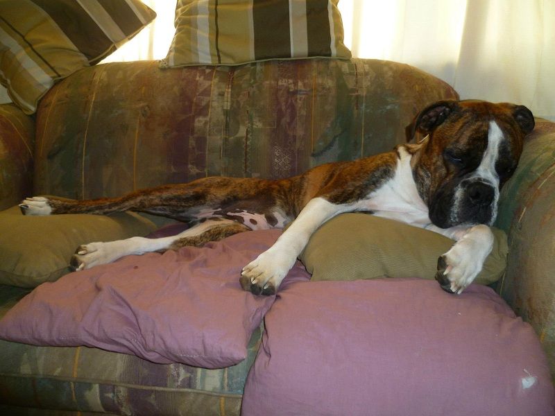 My oldie's name is Riggins...here he is lounging in his favourite chill spot. Like most oldies he has a long body, but you wouldn't know from this one...pretty funny.